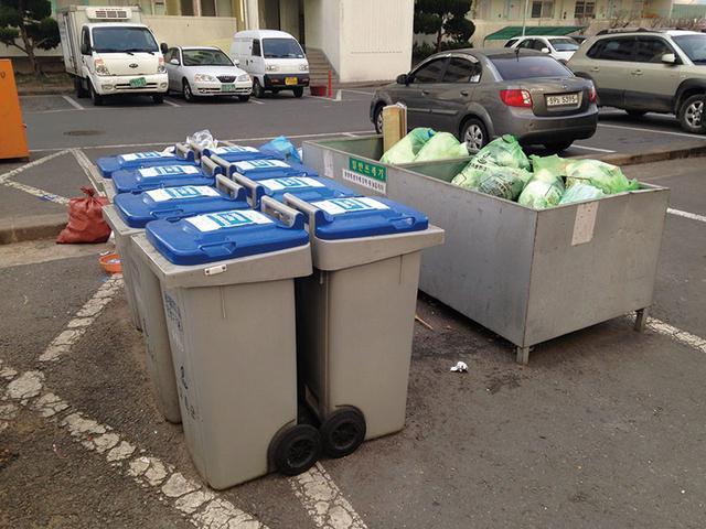 韓國的一處垃圾集中點,左邊藍蓋的垃圾桶放置食物垃圾,右邊開放式垃圾桶放置專用垃圾袋包裝的普通垃(lā)圾(jī)。