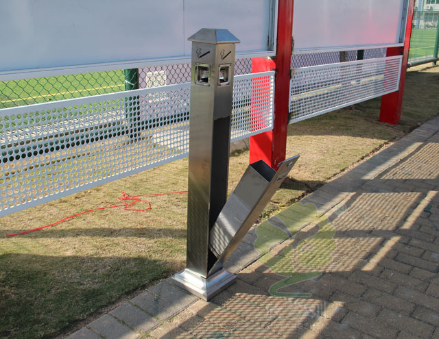C633-1廠家定製(zhì)滅煙柱采用優質不鏽鋼(gāng)剪切、組裝、焊接、絲印而成,它包括(kuò)外套管、支座、內套管、煙灰盒、底座。外套管的底端固定連接在支座上,外套管的側(cè)壁上設有煙蒂(dì)置入口,內套管用於集中收納從外(wài)套管的煙蒂置入口投入的煙蒂,內套管設在外套(tào)管的內管腔中,內內套管(guǎn)的開口端朝上(shàng),煙蒂置入口與內套管的開口相連通,以使得從煙蒂置入口投(tóu)入的煙蒂可從內套管的開(kāi)口端落入到內套管的內管腔中;