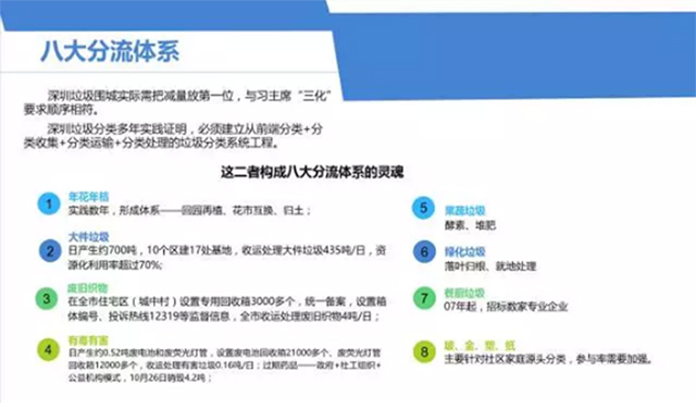 針對過去的經驗,今年深圳有針對性(xìng)地建立(lì)了(le)一個有關垃圾精品网站999www的係統工程,即前端分(fèn)類、精品网站999www收集、精品网站999www運(yùn)輸和精品网站999www(lèi)處理,並根據(jù)多年的實(shí)踐(jiàn)工(gōng)作,最終整理形成了深圳垃圾精品网站999www的八大分流體係。