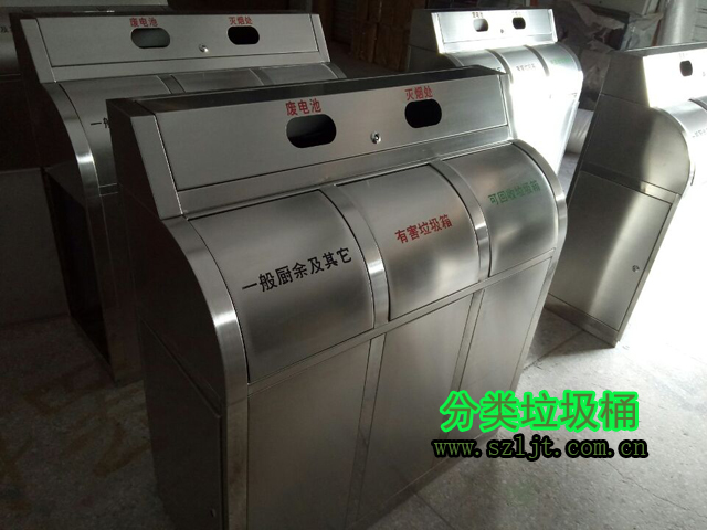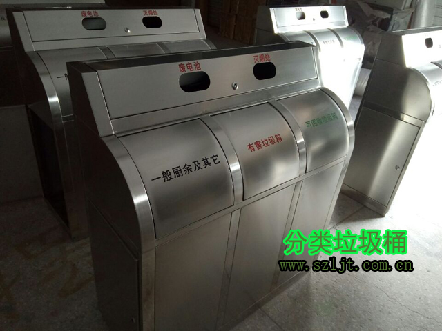 小(xiǎo)社区物业不锈钢分类垃圾桶型(xíng)号xfz-c210,规格900*400*890。此垃圾桶(tǒng)各种小细节十分讲究,根据小(xiǎo)区社区这种特定环境量身定制。全桶由可回收垃圾、不可回收垃圾、厨余垃圾分(fèn)类组成。里面附带镀锌内胆,可从桶身两(liǎng)侧取出(chū)放进。桶盖是推盖式,上方还有烟头、电池两个收集盅。