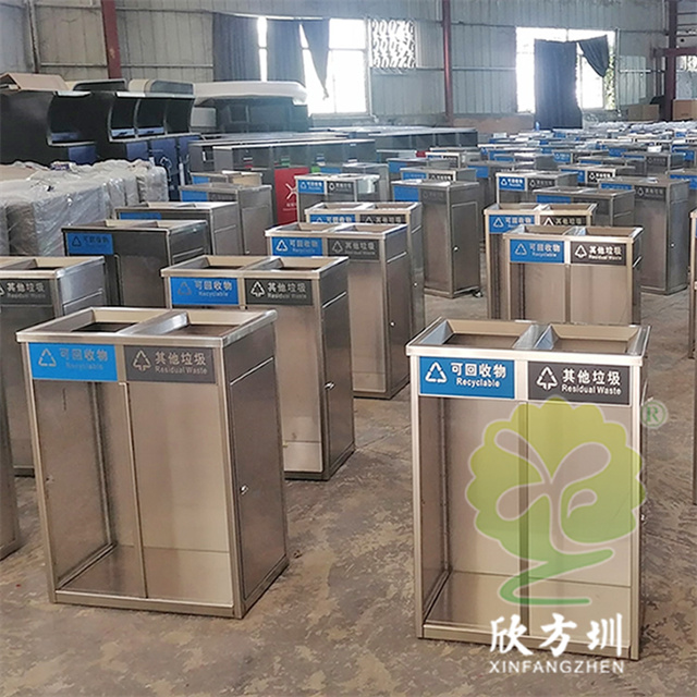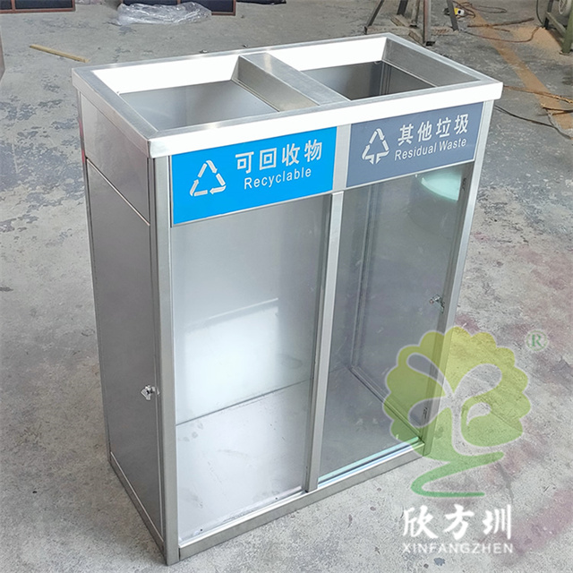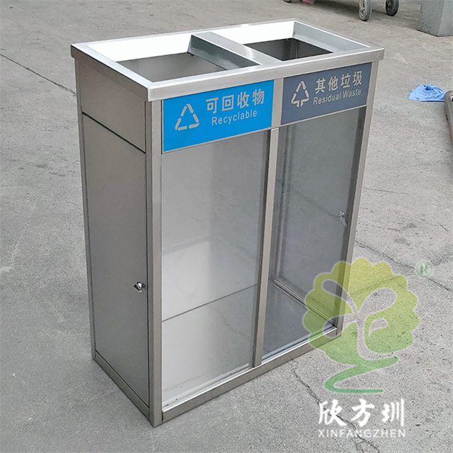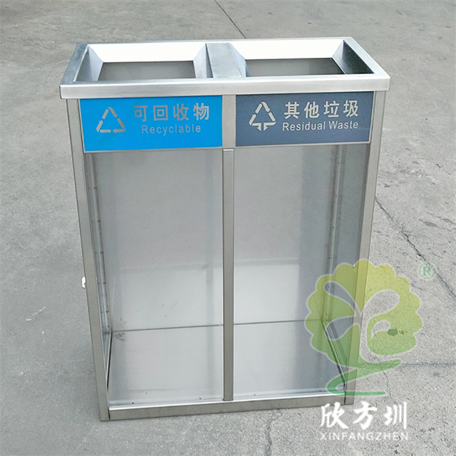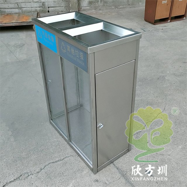 室內兩連體防(fáng)爆透明不鏽鋼精品网站999www垃(lā)圾(jī)桶整體材質采用了1.5mm厚(足(zú)1.42mm)生產,直投口(kǒu)立式方形兩連體精品网站999www設計,表麵不鏽鋼本色(sè)啞光,正麵上方橫條油墨絲印可回收物和其他垃圾國標(biāo)精品网站999www標識,左右兩邊使用了扭鎖(suǒ)方便(biàn)取出垃圾袋,無需要內筒直接套塑料透明垃圾袋使用,桶底部加四個腳膠墊這樣有效避免挪動發(fā)出聲響。