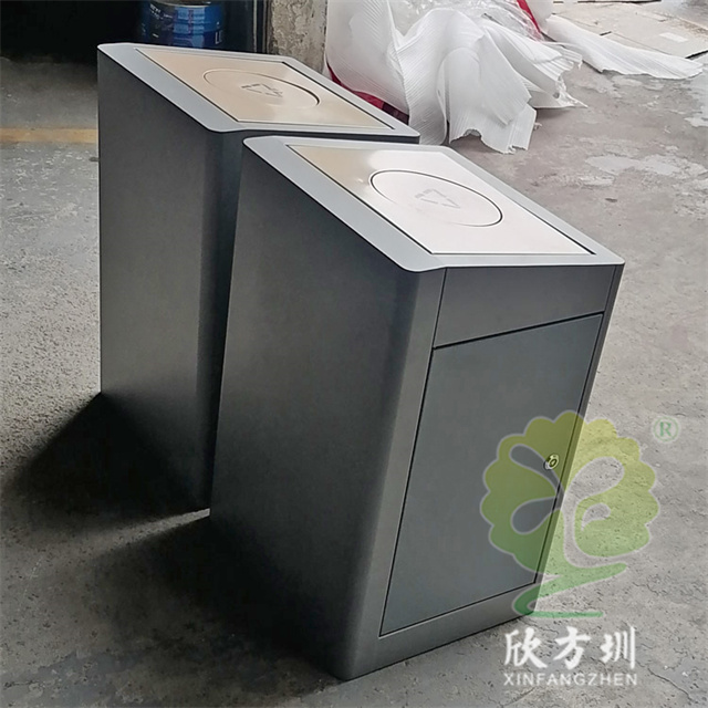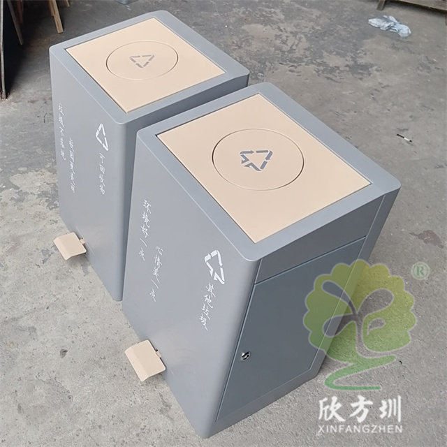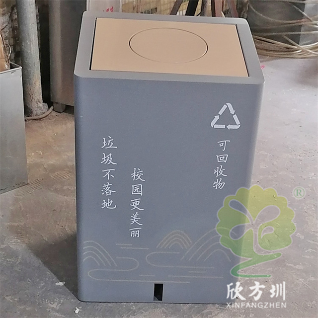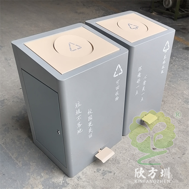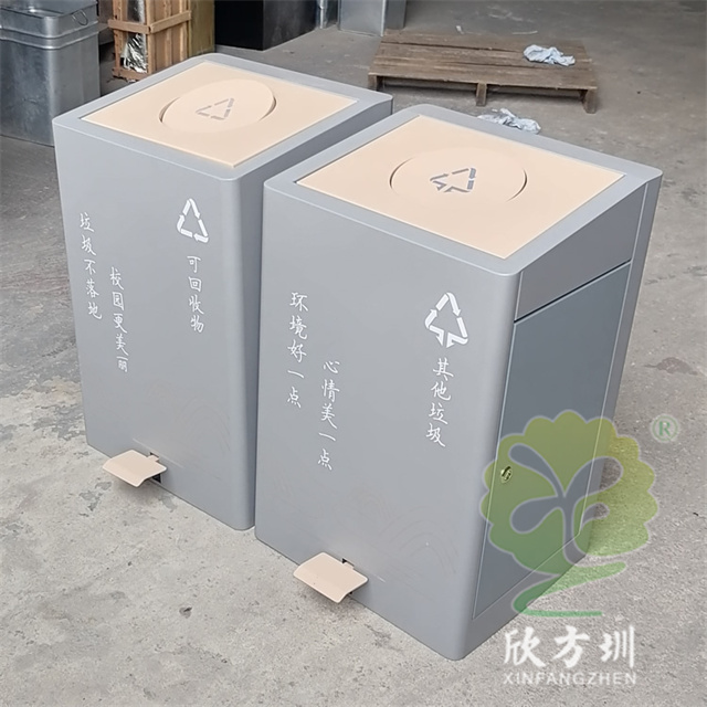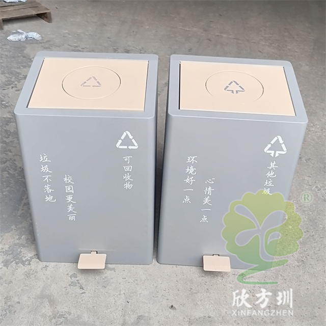 室內校園腳踏式(shì)不鏽鋼精品网站999www垃圾桶外桶整(zhěng)體優質201不鏽鋼生產,厚度1.0mm厚度(足0.92mm),方形組合式帶腳踏蓋子加搖蓋雙開蓋設計,顏色按照甲方要求顏色噴塑,外(wài)桶表麵整體噴塑淺灰色(sè),使用了白色油墨絲印(yìn)了可回收物和其他垃圾精品网站999www標識和文字。