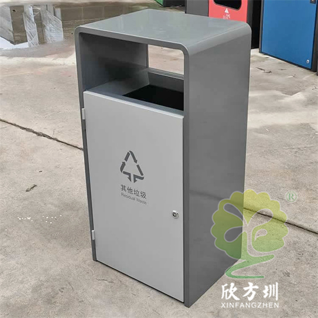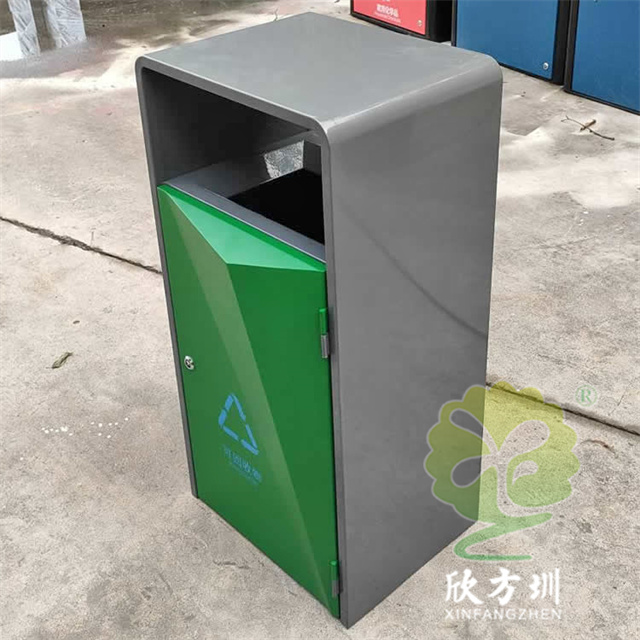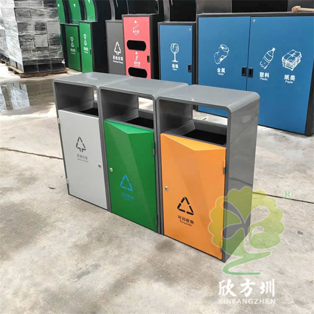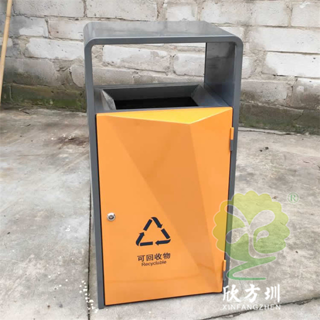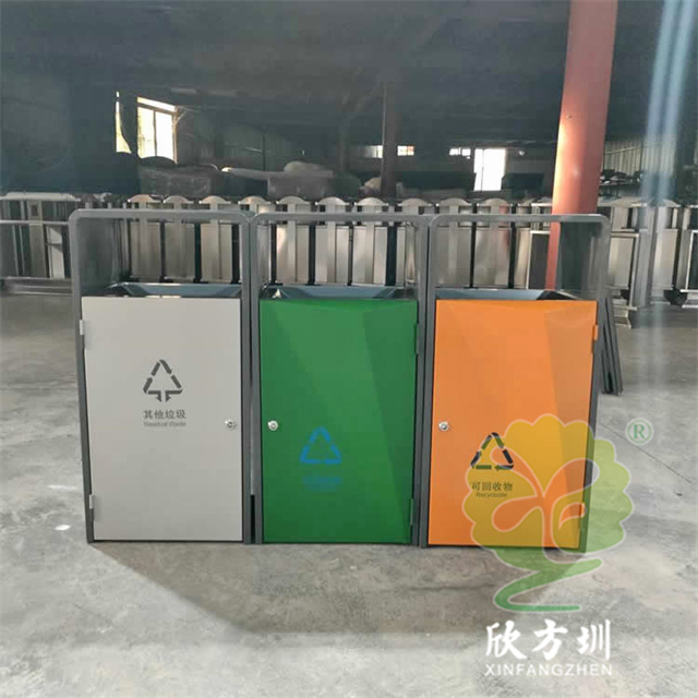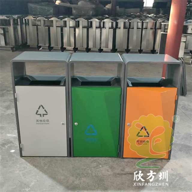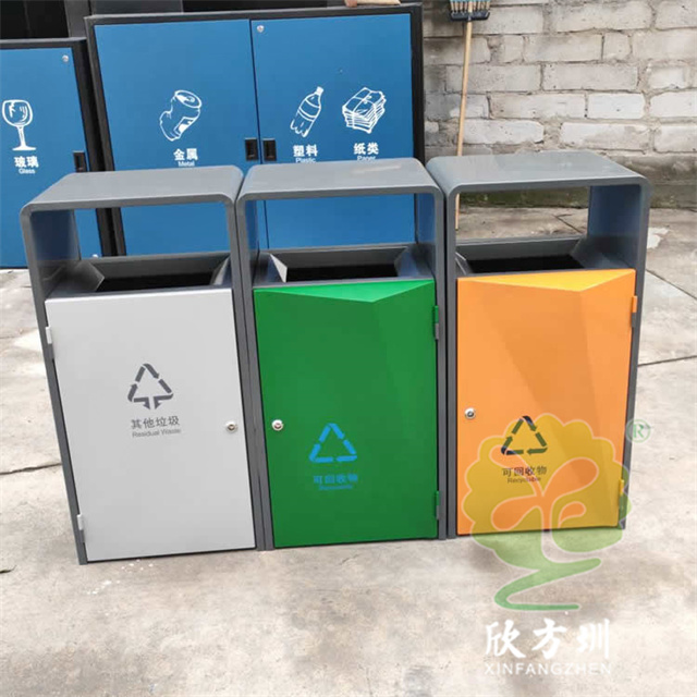 戶外學校三色(sè)菱形不鏽鋼分(fèn)類垃(lā)圾桶可以選用不鏽鋼板、冷軋鋼板、鍍鋅鐵板製作,方形單桶組合式設計(jì),框(kuàng)架表麵噴塑烤漆灰色(sè),橘黃色和綠色門板菱形設計,淺灰色平麵門板,門板可以絲印精品网站999www標識及企業logo,可以使用三角(jiǎo)鑰匙開門取出內筒。