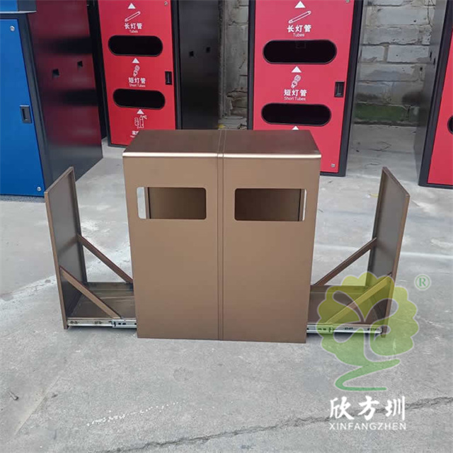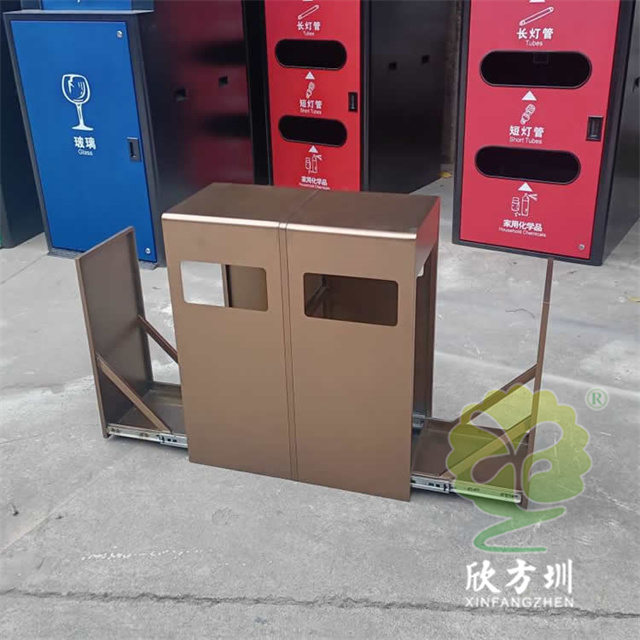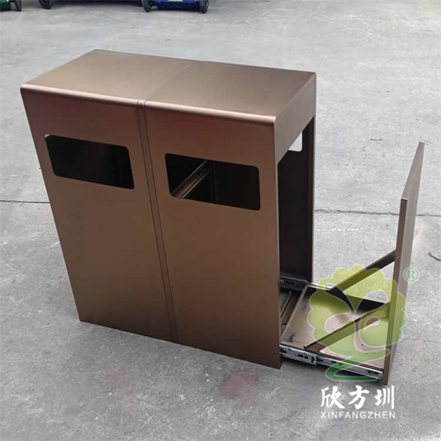 抽拉式滑軌電鍍防指紋不鏽鋼(gāng)精品网站999www垃圾桶采用了304不鏽鋼1.5mm厚的板製作而成,側(cè)麵兩連體精品网站999www抽拉式滑軌設計,果皮箱金屬表麵電鍍香(xiāng)檳金和做防(fáng)指紋處理工藝,正反麵(miàn)可以油墨絲網印刷(shuā)國標精品网站999www標識和企業logo,可以定製本色或者噴塑桶身。