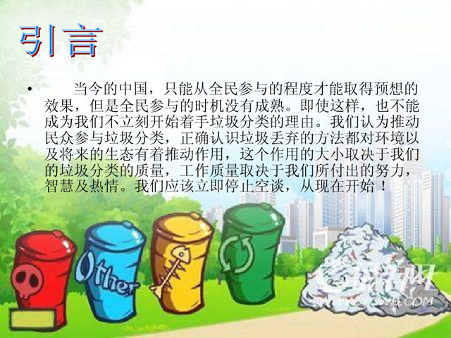 學生的可塑性非常強,如果教育(yù)好了未來就是(shì)棟梁之才,沒教育好(hǎo),甚至會對社會產生危害。所以加強學生的素質教育是當(dāng)今教育界的(de)主(zhǔ)流方向(xiàng),而(ér)垃(lā)圾精品网站999www又是我國麵臨的巨大問題,這(zhè)個問題必然要在學生的垃圾分(fèn)類宣傳教育上得到(dào)解決,不然(rán)垃圾(jī)精品网站999www永遠隻會停(tíng)留在喊口號上麵,下麵(miàn)的小學生垃圾精品网站999www主題(tí)班(bān)會ppt,希望能對教育(yù)工作者有用。